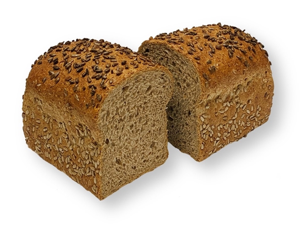 100% volkorenbrood met een stevige bite, gevuld en gedecoreerd met zonnebloempitten